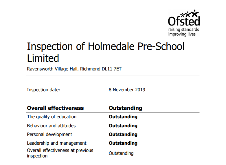 Prior to this, our last inspections were on 8th November 2019 in and on 4th September 2014 in our previous premises of Ravensworth Village Hall, when we were rated OUTSTANDING on both occasions.